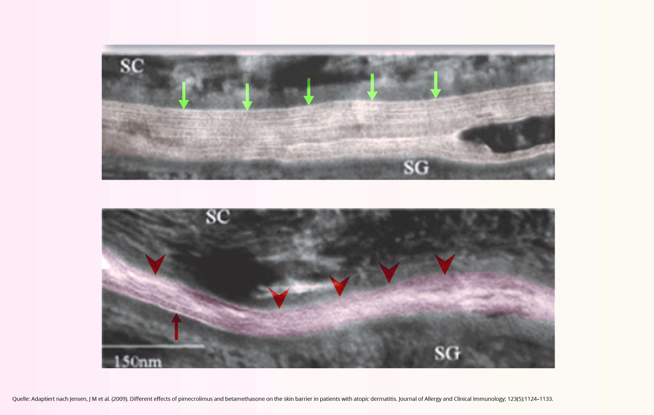 Abb. 2: Transmissionselektronenmikroskopische Aufnahme des Übergangsbereichs zwischen dem Stratum corneum (SC) und dem Stratum granulosum (SG): Nach Behandlung mit Pimecrolimus zeigt sich eine regelmäßige und kontinuierliche extrazelluläre Lipid-Doppelschichtstruktur (Aufnahme oben). Nach Behandlung mit Betamethason ist die Lipid-Doppelschichtstruktur unregelmäßig und zum Teil durchbrochen.